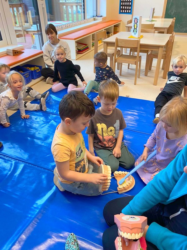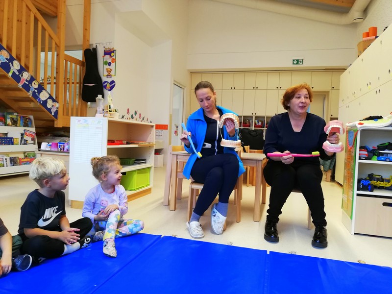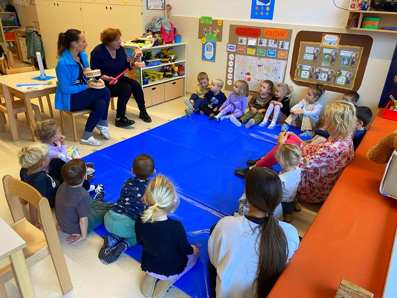 Naslednji del srečanja je bil namenjen skrbi za zobe. Sestri sta otrokom predstavili zgodbo o zobni miški, skozi katero so se naučili, zakaj je treba redno ščetkati zobke – tako zjutraj kot zvečer. S sabo sta imeli tudi model zob, na katerem so otroci lahko sami preizkusili ščetkanje. Ob tem so se naučili pravilne tehnike, saj sta medicinski sestri Alja in Milka korak za korakom pokazali, kako s ščetkanjem odstranimo ostanke hrane in preprečimo nastanek zobnih oblog.