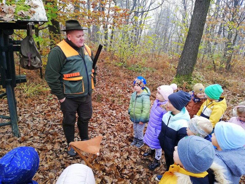 Nekega dne pa nas je v gozdu presenetil tudi lovec Dejan. Predstavil nam je poklic lovca, nam razložil kakšna je njegova oprema. Poleg zložljivega stola, nahrbtnika, puške so med njegovimi pripomočki tudi daljnogled, nepremočljiva obleka, obutev ter nož.