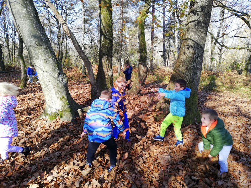 Igralčki se zavedamo, da smo v gozdu le na obisku, zato nismo preglasni, da ne prestrašimo gozdnih prebivalcev. Ko potrkamo na gozdna vrata, si v trenutku prav vsak hitro najde zaposlitev- raziskujemo gozdna tla, opazujemo mimoidoče žuželke, sprašujemo se kaj vse raste na deblu, poigravamo se z jesenskim listjem, najdemo kakšen gozdni zaklad, za šakala pripravimo mehko posteljo, iščemo živalske sledi, kuhamo okusno juho, se gugamo, hodimo po deblu in koreninah ter plezamo po deblu navzgor...