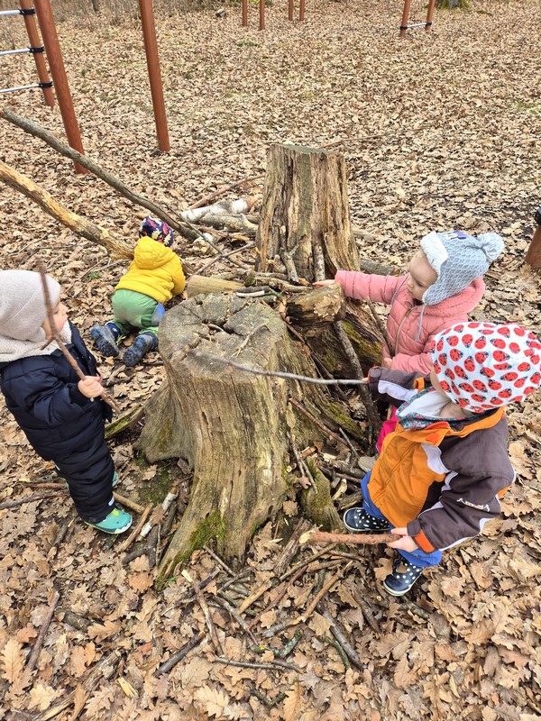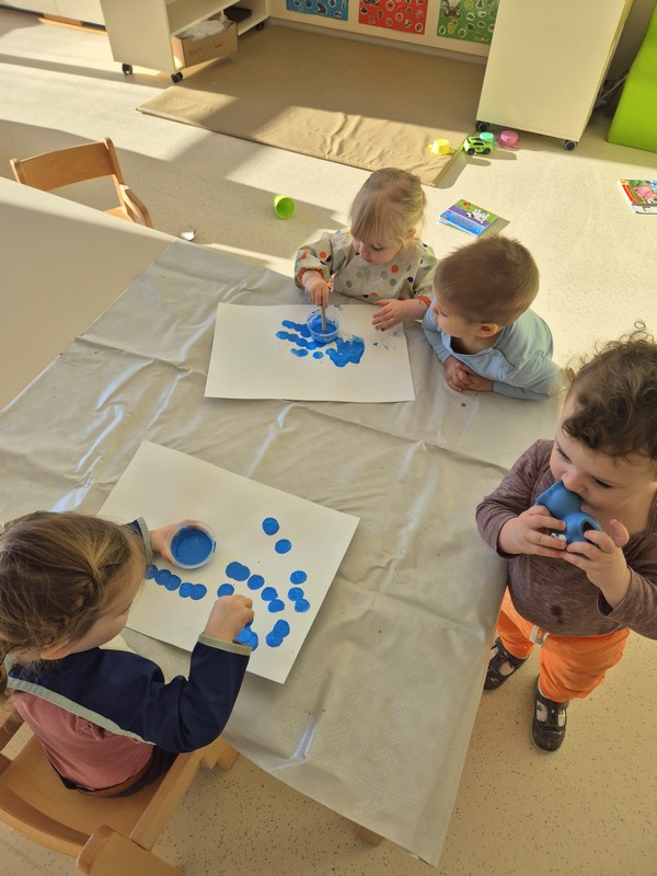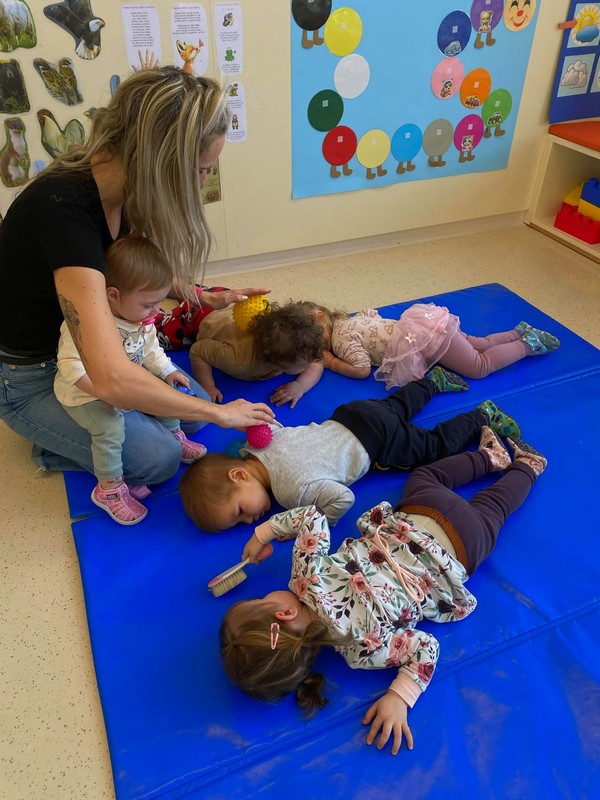 Veliko smo plesali, se igrali, peli, navajali na umirjanje in masažo z žogicami, raziskovali in spoznavali nove igrače, se odpravili na svež zrak v gozd in prvič tudi poprijeli za čopiče in lepilo. V skupino smo dobili tudi novo prijateljico Nino, ki se na nas še privaja, mi pa smo jo zelo lepo sprejeli.