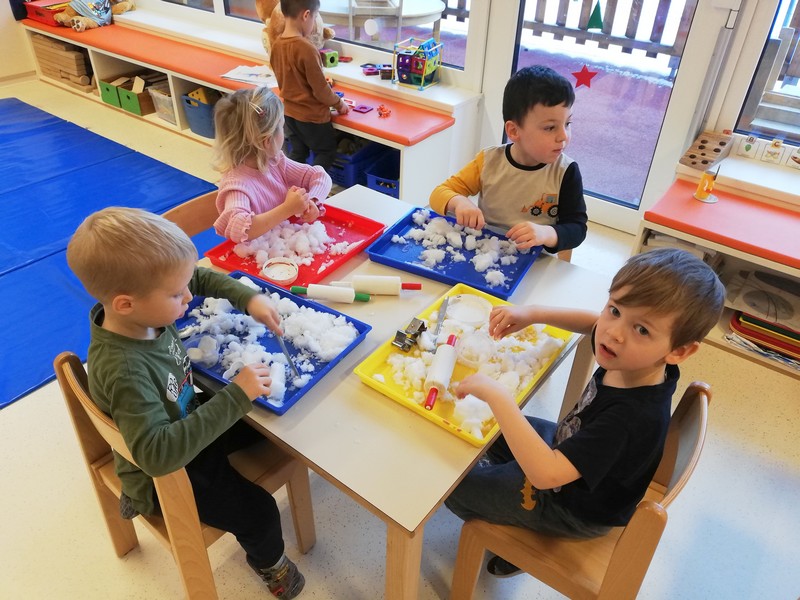Januar nas je presenetil s snegom, ki smo ga končno dočakali tudi na hribčku Artič. Nekega jutra je pobelil našo pokrajino in s tem najbolj razveselil vrtičkarje. Seveda smo odšli v polni opremi na snežno odejo in zaužili zimske radosti. Valili smo kepe, se kepali, metali in lovili po snegu ter naredili snežaka. To je bilo veselje, vendar pa ni trajalo dolgo, saj je sneg kmalu skopnel. Še dobro, da nas je vmes obiskala babica zima s prelepo pravljico in pesmico, ki jo še danes radi zapojemo.