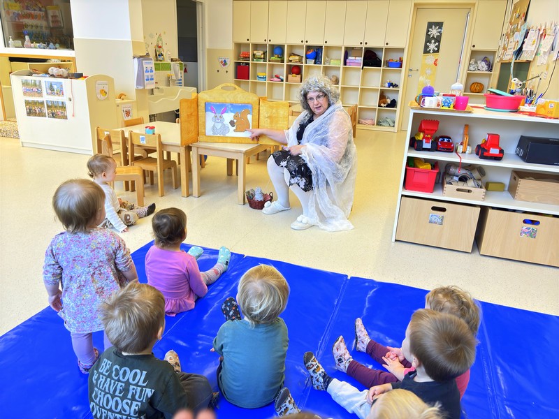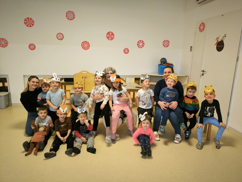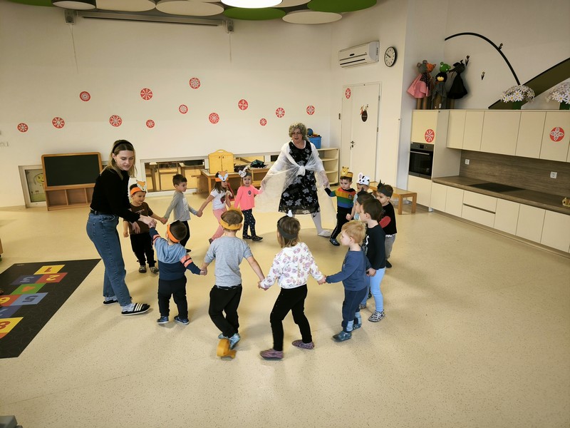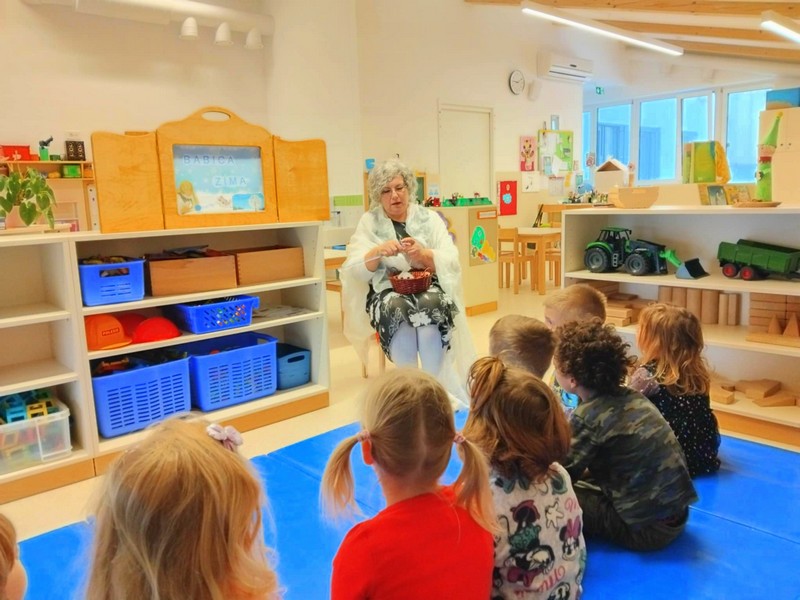 V mesecu januarju je na vrata igralnic potrkala vzgojiteljica, ki se je preoblekla v to čarobno zimsko vlogo in otroke presenetila v prostorih vrtca. Z uvodno instrumentalno glasbo pesmice »Babica Zima« smo se v meglenih januarskih dneh popeljali v čarobni svet zime, ki s svojo snežno odejo svet odene v belino, a je žal pri nas ni bilo veliko.