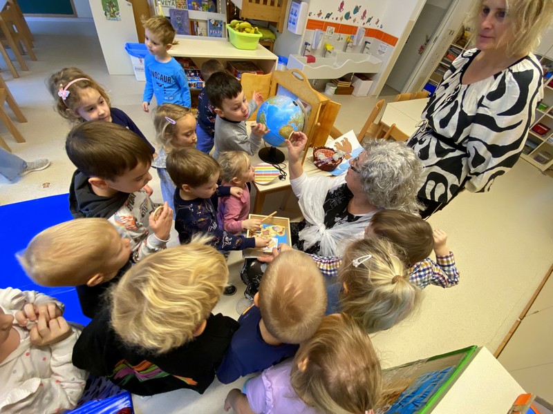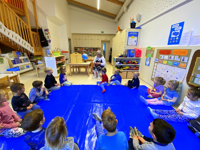 Babica Zima se je Igralčkom pridružila med jutranjim razgibavanjem ob glasbi, kar jo je precej utrudilo. Saj veste, kako pravijo babice, da so že dolgo na svetu … in v tistem trenutku je zagledala globus, na katerem je »cel svet«. Otroci so ji razložili, kje prebivajo pingvini in kje Eskimi gradijo igluje. V njeni torbi se je poleg lesenega butaja z ilustracijami in fotografijami ter naglavnimi trakovi z motivi živali iz pravljice, znašla še nova didaktična igrica s podobami živalic, ki jih bodo lahko razporejali glede na barve ozemlja, kjer živijo.