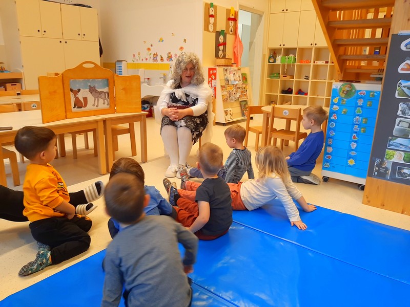 Plezalčki so jo sprejeli nasmejani in z zanimanjem spremljali pripovedovanje pravljice ob pomoči ilustracij v kamišibaju. Hitro so tudi odgovorili, da ptički potrebujejo toplejše perje in da nimajo kožuščkov. Plezalčki se velikokrat odpravijo v gozd, zato dobro vedo, kako se je potrebno toplo obleči, kadar je zunaj mraz.
