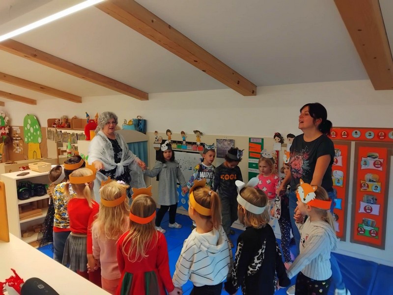Babica Zima je potrkala še pri Navihančkih, ki so povedali, da tudi njihove mamice znajo šivati in »štrikati«. Babica Zima je med pripovedovanjem pletla topel šal za volka … Otroci so se prelevili v svoje najljubše like iz zgodbe, nato pa smo vsi skupaj zarajali in zapeli nekaj zimskih pesmic.