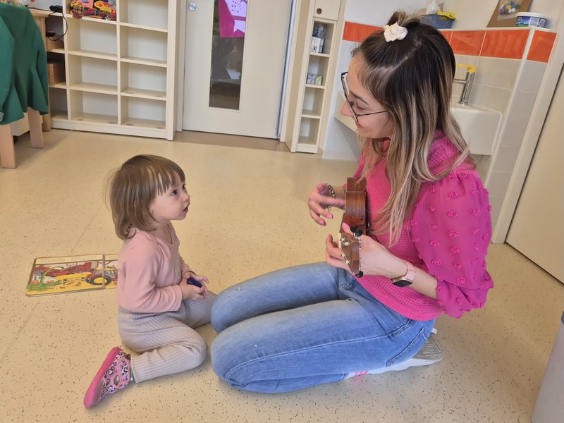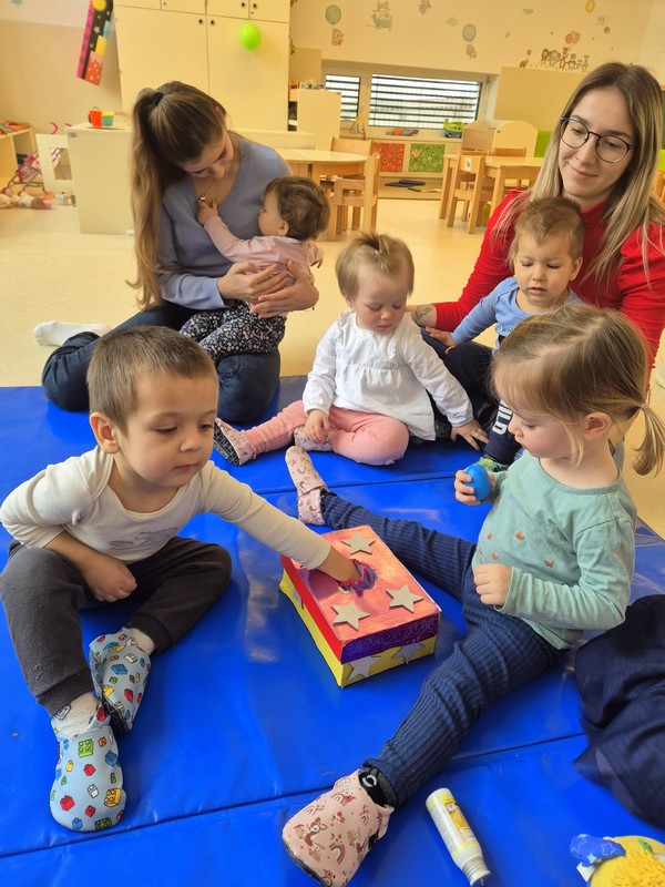 Praznovali smo kar dva rojstna dneva in ob tej priložnosti veselo zapeli in zaplesali, kot to radi počnemo vsakodnevno, še posebej ob ukulele in otroški spremljavi na ropotuljice. Obiskala nas je skrivnostna škatlica, v kateri so se skrivali različni predmeti. Razveselili smo se tudi Palčka Bralčka, ki nam je prinesel nove knjige in je že odšel prvič z enim izmed otrok domov. Odkrivali in igrali smo se z novimi igračami in poskrbeli, da so pospravljene na svojem označenem mestu. Nismo pozabili niti na dejavnosti pri mizi, s katerimi razvijamo in krepimo motoriko in koncentracijo.