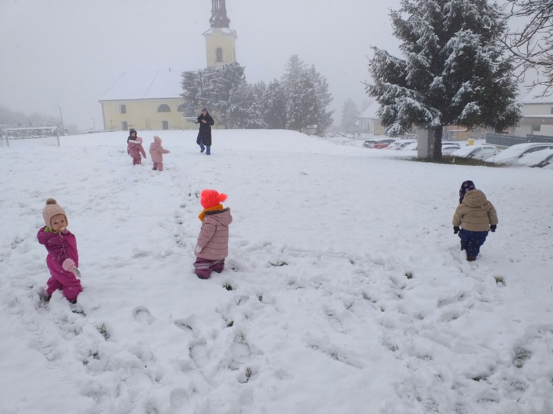 Opazovanje zasnežene pokrajine skozi okno nas je prevzelo. Nekateri smo z občudovanjem zrli na pobeljeno teraso, drugi kazali na snežinke, ki so poplesavale v zraku. Ko smo končno stopili na sneg, je bilo veselje neizmerno, četudi smo v snegu le obstali ali za sabo puščali stopinje in ga seveda poskusili z našimi radovednimi jezički.