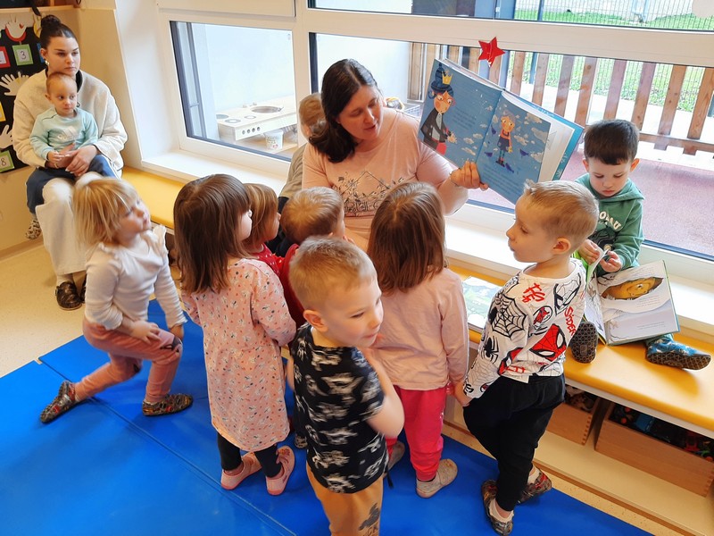 Obiskali smo šolsko knjižnico, kjer smo raziskovali knjige in prisluhnili zgodbam. Poseben obisk pa nas je zelo razveselil, saj je prišla mamica enega izmed naših otrok in nam prebrala čudovito pravljico, ki nas je popeljala v svet domišljije in ustvarjanja.