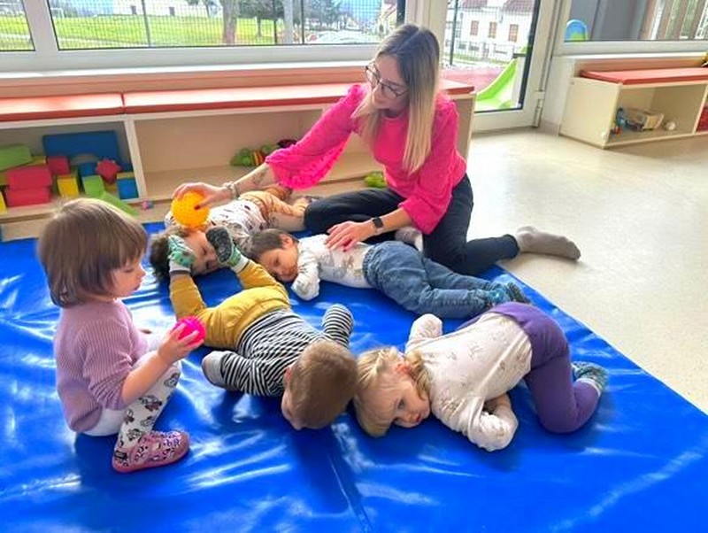 Najmlajši SONČKI in Ringarajčki neizmerno uživajo v vodeni vizualizaciji in masaži z žogicami. Nežni krožni gibi po celem telesu jim pomagajo pri boljšem spanju in zmanjševanju napetosti, ki je še malce prisotna ob ločevanju od staršev. Vzgojiteljici Sončkov pa se že sprašujeta ali si bo kdo od otrok izbral poklic maserja, saj velikokrat radi priskočijo na pomoč.![]()