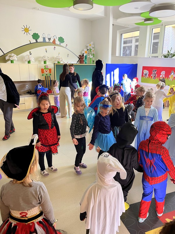 Otroci oz. maske vseh skupin so se skupaj pozabavale ob glasbi, se predstavile in zaplesale. Zelo so se trudili, da bi s skupnimi močmi odgnali zimo in po sledeh cvetlic, ki smo jih našli, mislim da nam je uspelo.