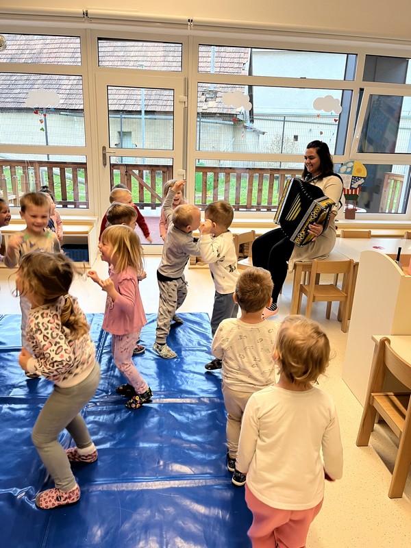 Velik del meseca marca pa smo posvetili vajam za nastop ob materinskem dnevu. Otroci so predstavili 2 deklamaciji, pesem ob spremljavi, ter pomladni ples. Ob tem nas je pri jutranjih vajah presenetila tudi vzgojiteljica Larisa G. s svojo harmoniko - kakšna zabava!