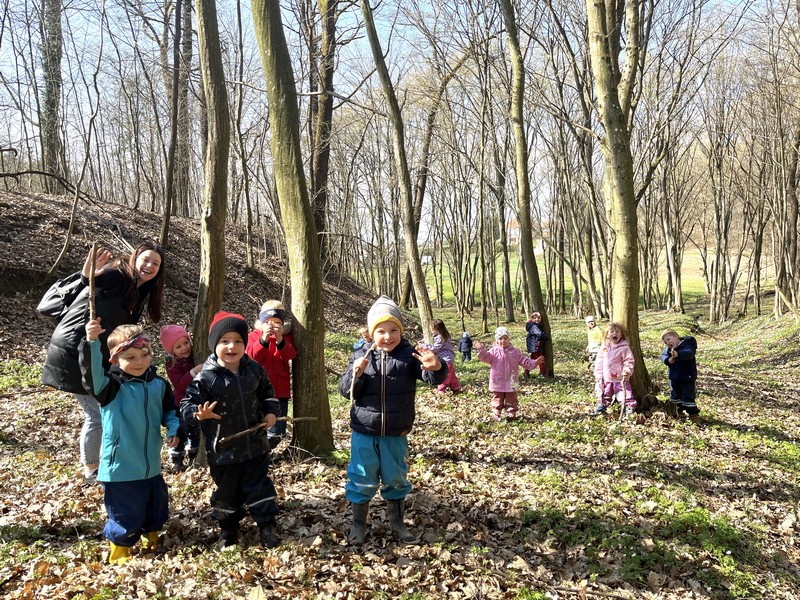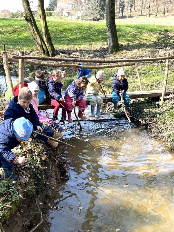 Obiskali smo gozd, prehodili hribe in se spustili po blatnih toboganih, medtem pa opazovali prelepe barvne cvetlice, ki so naznanjali pomlad. Da pa cvetlic nismo trgali, smo le te izdelali sami iz kartonskih škatel za jajce in z njimi okrasili našo garderobo. Izvedli smo pohod do potoka, ter se med tem vstavili pri hiški, kjer smo pojedli malico in uživali v razgledu na Brežice. Ob potoku smo poiskali dolge veje, ter z njimi lovili ribe.