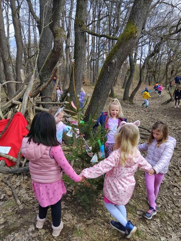 V našem kotičku pri škratu Prijateljčku nas obdaja posebna čarovnija in prepričani smo, da so med nami tudi ostala pravljična bitja. Zato smo ta del gozda še posebej temeljito pregledali in očistili smeti. Počutili smo se odlično in ponosni smo bili nase za dobro opravljeno nalogo. Med pospravljanjem smo našli smrečico in jo postavili pred hišico škratka Prijateljčka ter jo okrasili z velikonočnimi okraski, ki so jih deklice prinesle od doma. Fantje so stopili skupaj, zavihali rokave in se spremenili v prave tabornike. Postavili so svoj šotor in se posvetovali, kaj vse potrebujejo za bivanje v naravi. V gozdu res vsak najde svoj kotiček, v katerem se počuti prijetno, varno in sprejeto. In takrat, ko se počuti dobro, se v njem prebudi otroška domišljija, ki nima meja in neštetokrat preseneti odraslega, kaj vse zmorejo te majhne glavice.