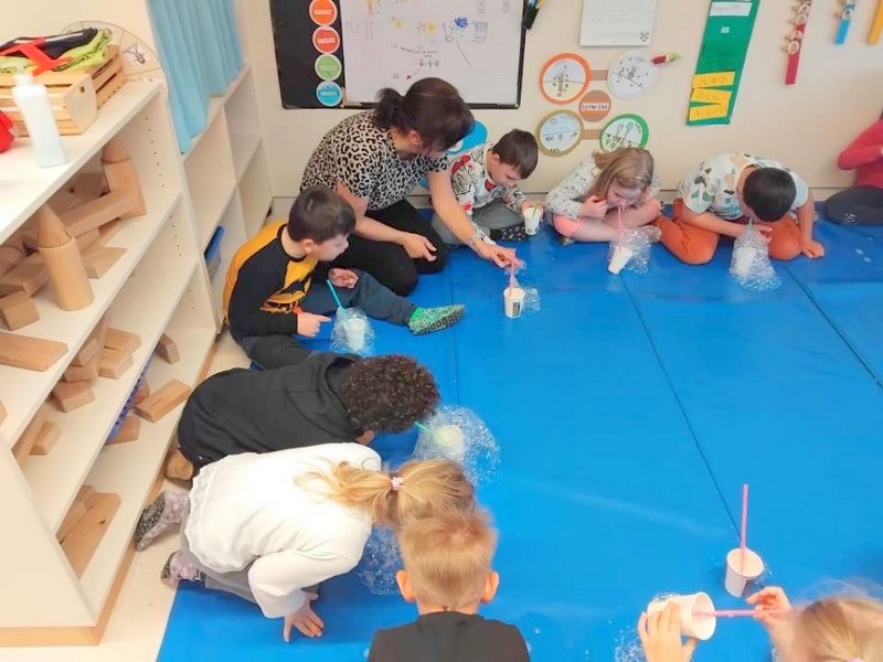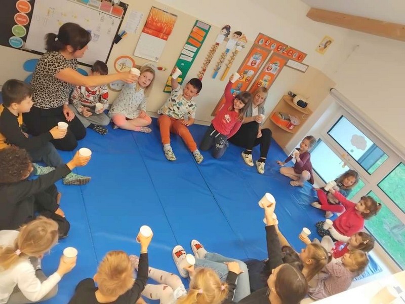 Vse to pa skrivaj opazuje škratek, ta navihani mali možic, ki je vesel, ko otroci sodelujejo, si pomagajo in se igrajo skupaj. Takrat nas preseneti s posebno nagrado…tokrat je bila to nova zgodba. O škratku Skakalčku, ki je jedel nezdravo hrano in je zaradi bolečin v trebuščku pristal v bolnišnici. Ojoj, to pa ni v redu, smo se strinjali. Zato smo veliko govorili o zdravi prehrani, pitju vode in pomenu gibanja za naše zdravje. Na poti iz gozda smo tekli in pospešili bitje našega srčka, izdelali namizno igro o sadju, premagovali poligone v telovadnici ob slabem vremenu in poleg pitja vode tudi pihali mehurčke ter se zraven zabavali.