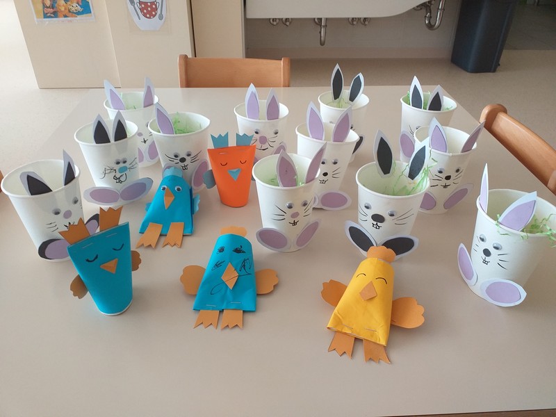 Navihančki in Igralčki so ustvarjali zajčke (zgibanka) s košarico, v katere so dali pisane pirhe, ki so jih z vatiranimi palčkami pobarvali s tempera barvami. Nastajali so tudi naglavni zajčki in s pomladnimi rožicami okrašene košarice za na vrata.