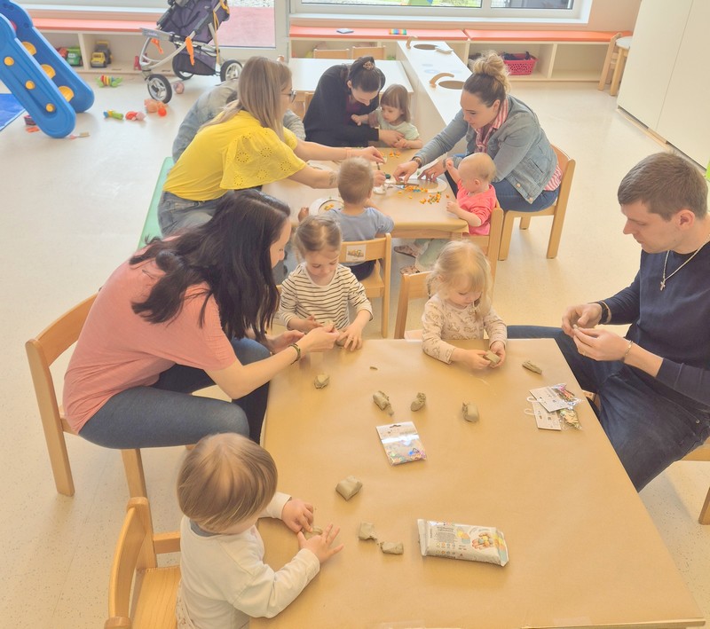 Ob druženju in klepetu so tudi pri Plezalčkih in Cepetavčkih nastajali čudoviti izdelki. Otroci so z veseljem barvali jajčke iz kartona, nizali volno, izdelovali piščančke in zajčke iz odpadnega materiala ter iz barvnega papirja ustvarjali praznične košarice. Tudi glina se je gnetla pod prstki in še dobro da so bile na obisku mamice in babice, saj jim je šlo bolje od rok
