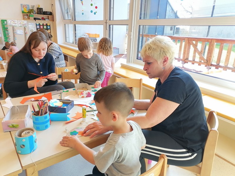 Ob druženju in klepetu so tudi pri Plezalčkih in Cepetavčkih nastajali čudoviti izdelki. Otroci so z veseljem barvali jajčke iz kartona, nizali volno, izdelovali piščančke in zajčke iz odpadnega materiala ter iz barvnega papirja ustvarjali praznične košarice. Tudi glina se je gnetla pod prstki in še dobro da so bile na obisku mamice in babice, saj jim je šlo bolje od rok
