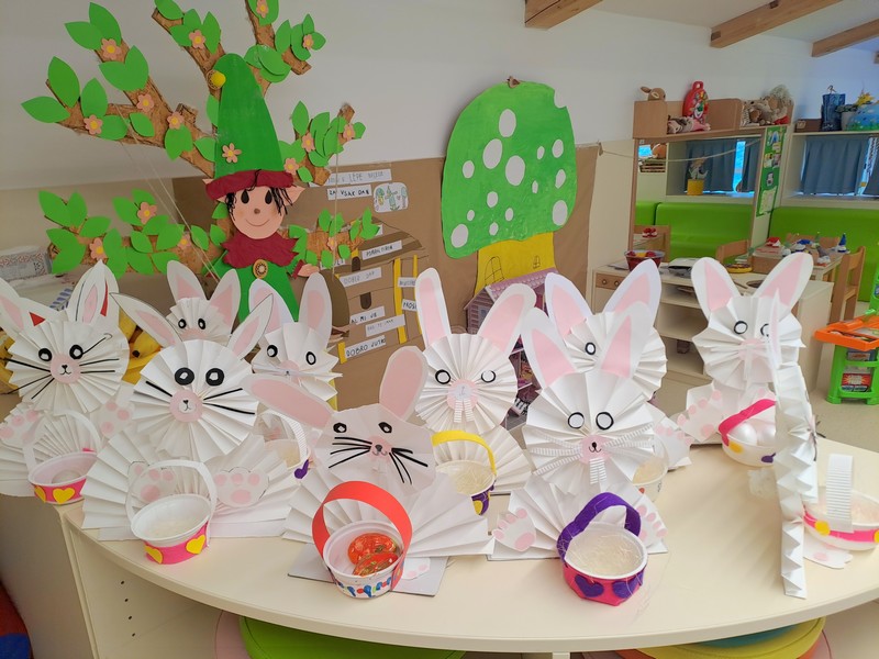Navihančki in Igralčki so ustvarjali zajčke (zgibanka) s košarico, v katere so dali pisane pirhe, ki so jih z vatiranimi palčkami pobarvali s tempera barvami. Nastajali so tudi naglavni zajčki in s pomladnimi rožicami okrašene košarice za na vrata.