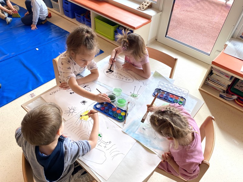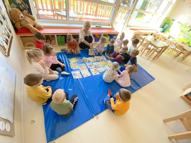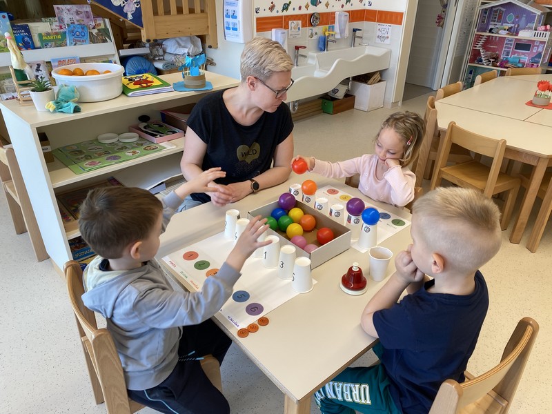 Igralčki z vzgojiteljico Natašo in Heidi.