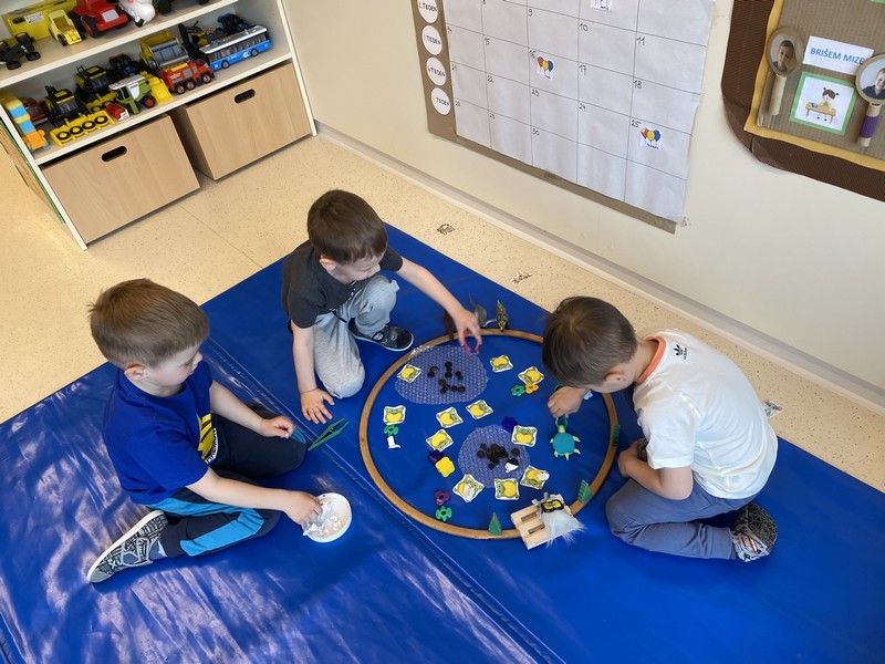 Igralčki z vzgojiteljico Natašo in Heidi.