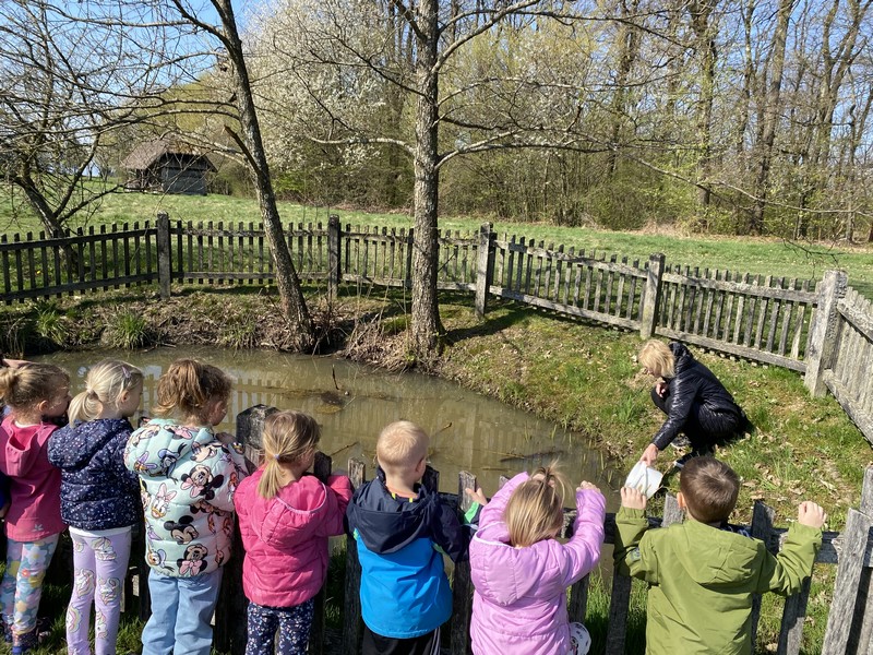 Ker pa so naši paglavčki, ki smo jih pridno opazovali, že zrastli in potrebovali več prostora za življenje, smo jih skupaj odnesli nazaj v mlako. Zdaj, kadar se odpravimo v Banovo hosto, se vedno ustavimo pri mlaki in z veseljem opazujemo, če bomo kje zagledali katero od naših žabic.