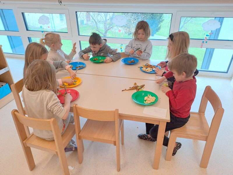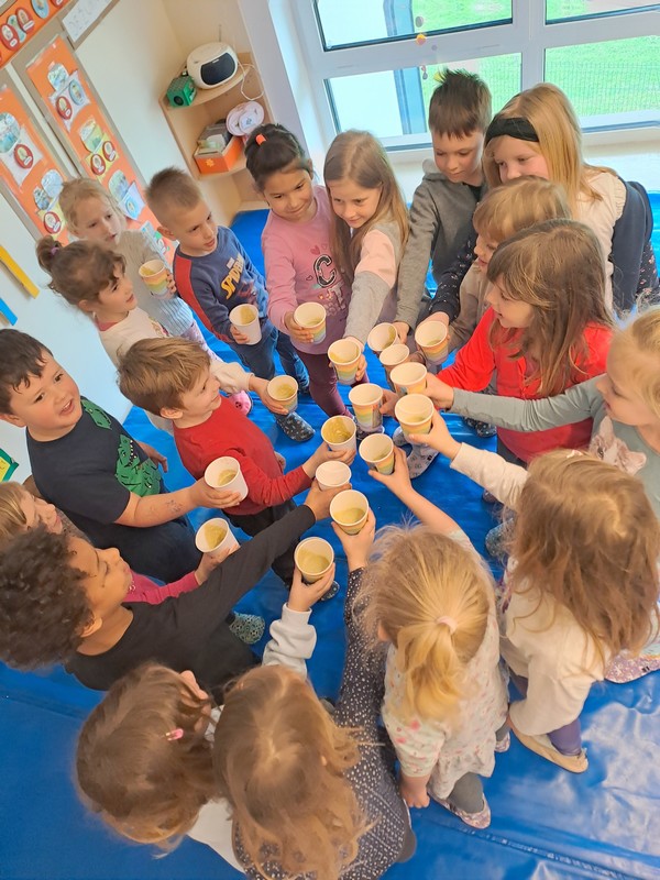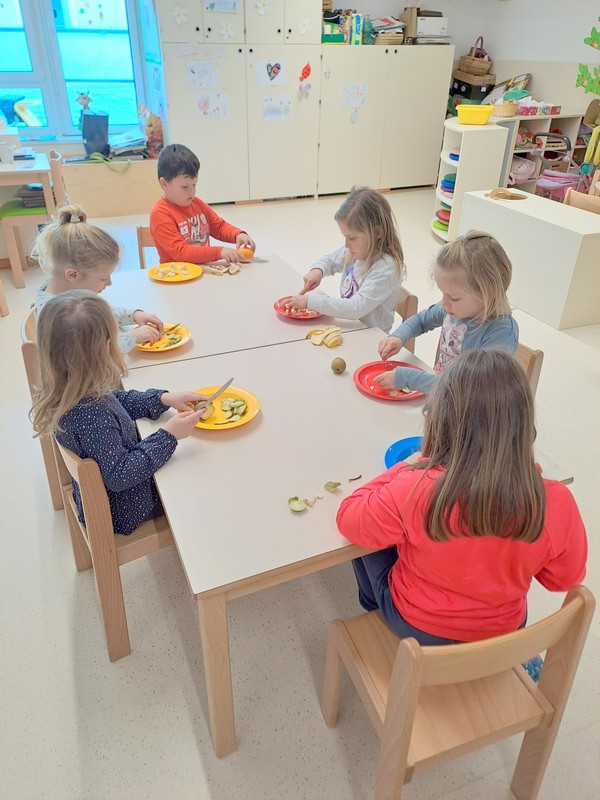 Vsak otrok si je izdelal svoj prehranski krožnik, s čimer smo utrjevali znanje o uravnoteženem obroku. Pripravili smo tudi okusen sadni smuti in skupaj odkrivali, kaj vse lahko vanj vmešamo, da bo zdrav in okusen.