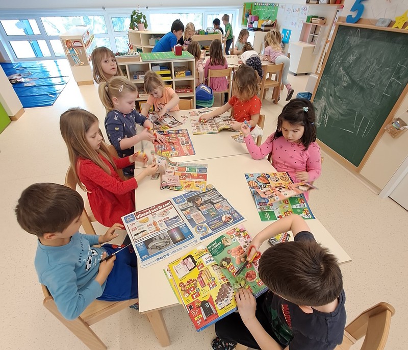 Iz odpadnega materiala smo izdelali pravo prehransko piramido. Otroci so iz reklamnih letakov izrezovali različna živila in jih skupaj razvrščali po ustreznih mestih na piramidi. Tako smo se pogovorili o tem, katera hrana je za naše telo najbolj koristna in katero naj uživamo le občasno. Poudarili smo tudi, kako pomembno je poleg raznolike in pravilne prehrane veliko gibanja ter pitje zadostne količine vode.