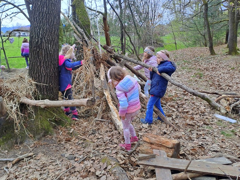 Ker pa vemo, da je za zdravje poleg prehrane pomembno tudi gibanje, vsak dan poskrbimo za raznolike gibalne dejavnosti. Jutra začnemo z razgibavanjem ob glasbi, igramo se različne gibalne in glasbeno-didaktične igre, v skupnem prostoru izvajamo vodene vadbene urice. Radi hodimo na sprehode, se igramo na igrišču, še posebej pa uživamo, ko gremo v gozd. V njem plezamo po drevesih in klančinah, premagujemo naravne ovire, prenašamo veje in gradimo naravna bivališča. Preden vstopimo v gozd, pa pogosto tudi tečemo po travniku.