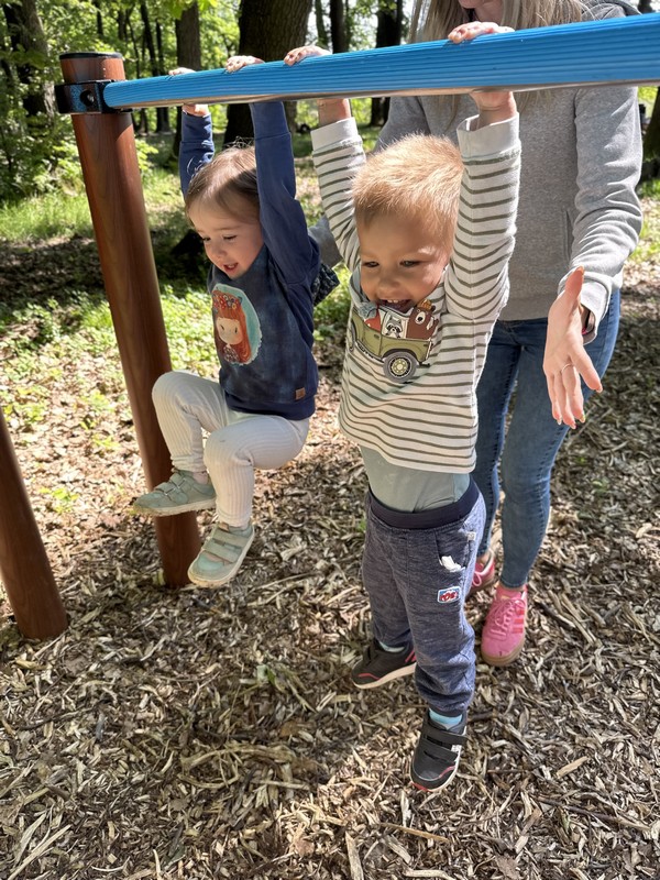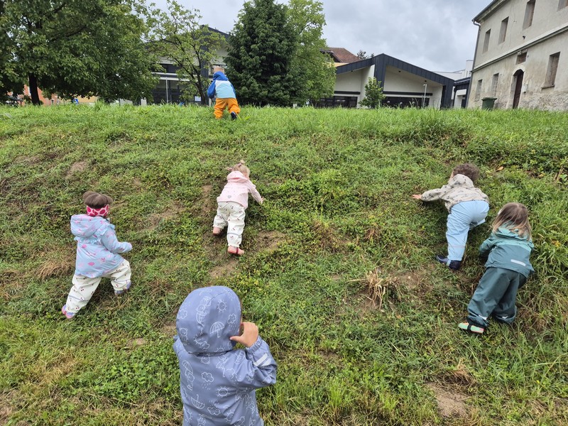 Na bližnjem hribu smo se urili v plezanju, se spuščali po mehki travi, se lovili in kotalili. Otroci so ob tem razvijali svoje grobe gibalne sposobnosti, pridobivali ravnotežje, moč in samozavest. Hrib je postal priljubljena postojanka naše skupine – vedno znova smo se vračali z novimi idejami za igro.