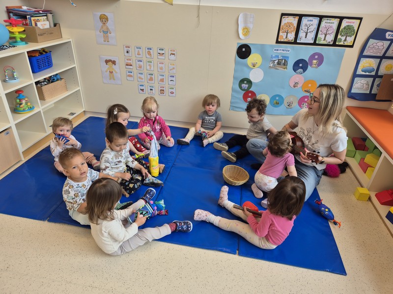 Z ropotuljicami, zvončki in bobenčki smo skupaj ustvarjali glasbo. Ob ritmu pesmic smo razvijali sluh, občutek za ritem in koordinacijo gibov. Najljubše so nam bile otroške pesmi z enostavnimi ponavljajočimi se refreni, ob katerih so otroci tudi zaplesali.