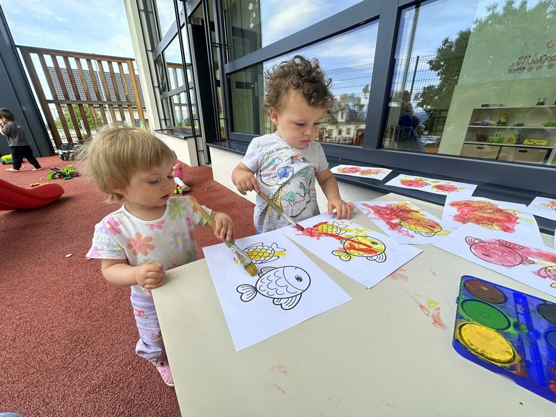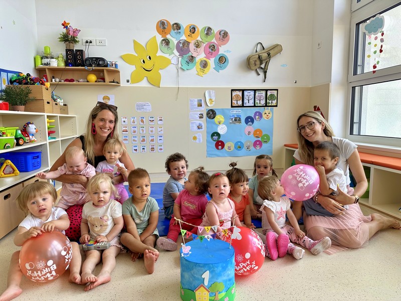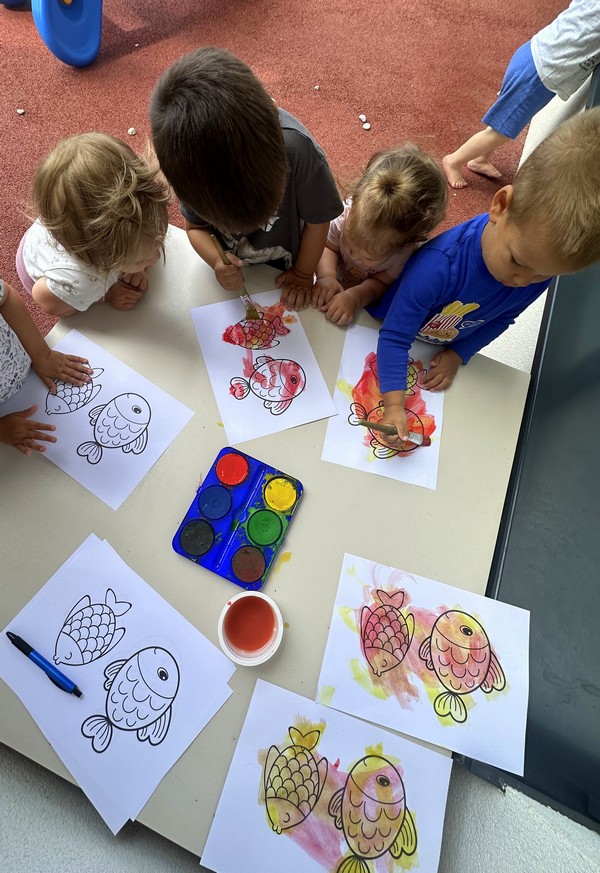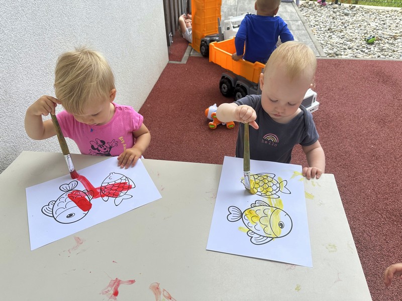Poskrbeli smo tudi za ustvarjalni kotiček, kjer so nastajali poletni motivi. Izdelovali smo akvarij, barvali ribe, školjke, morje. Igrali smo se s skrivnostno škatlico in ugibali kaj se v njej skriva. Praznovali pa smo tudi dva rojstna dneva. Drugi rojstni dan dečka in prvi rojstni dan naše novinke.