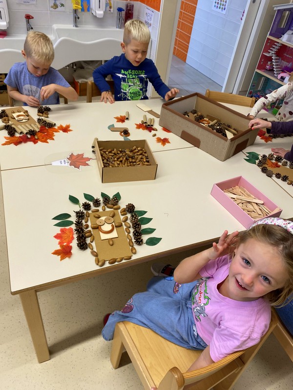 V gozdu smo se igrali z listjem, v igralnici pa ustvarjali jesenska drevesa. Ob sredah nas je obiskovala miška Neli, ki je poskrbela za glasbeno veselje. Telovadili smo, plesali po hodniku in se razveselili obiska škrata Prijateljčka. Obeležili smo tradicionalni slovenski zajtrk, se razveselili snega in prisluhnili knjižničarki Andreji, ki nam je prebrala zgodbo Veliki bučni podvig.
