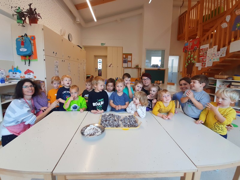 Preizkusili so se tudi v gnetenju čokoladnih kroglic s kokosom, s katerimi so se posladkali po kosilu. Otroci so pomagali pri mešanju sestavin, oblikovanju kroglic in posipanju s kokosom. Pripravili so jih tudi za mamice, ki so se v popoldanskem času udeležile srečanja, na katerem so poklepetale in igrale igro Jesenski bingo.