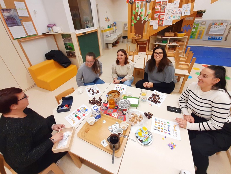 Preizkusili so se tudi v gnetenju čokoladnih kroglic s kokosom, s katerimi so se posladkali po kosilu. Otroci so pomagali pri mešanju sestavin, oblikovanju kroglic in posipanju s kokosom. Pripravili so jih tudi za mamice, ki so se v popoldanskem času udeležile srečanja, na katerem so poklepetale in igrale igro Jesenski bingo.