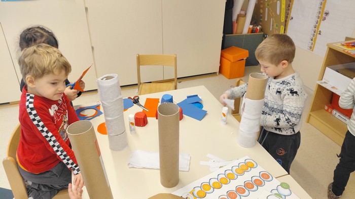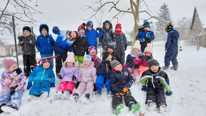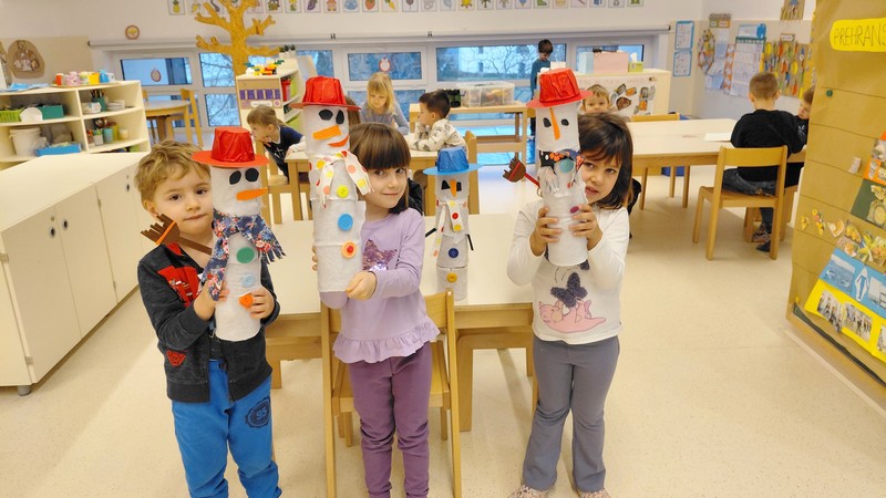 Ker pa smo zelo radovedni, smo delček zime prenesli kar v igralnico. S snegom smo se igrali, ga opazovali in raziskovali. V plastenke smo nalili vodo in jih postavili na okensko polico, kjer vsak dan spremljamo, kako se voda spreminja in zmrzuje. Ob tem smo peli zimske pesmice, se naučili deklamacijo in veliko ustvarjali. Iz odpadnega materiala so nastali veseli snežaki, z vodenimi barvami pa čisto prave zimske umetnine.