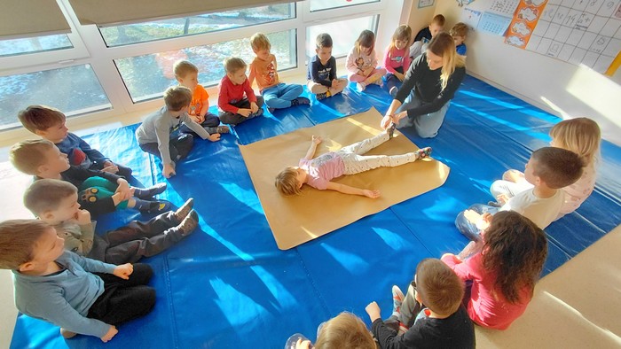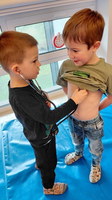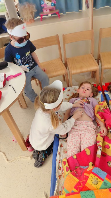 Veliko smo se pogovarjali o našem telesu, naredili obris otroka in poimenovali dele telesa. V človeško telo smo prilepili srce in narisali krvni obtok. S pravim stetoskopom smo poslušali bitje našega srca ter ugotavljali, kdaj bije hitreje in kdaj počasneje. Ritem srca smo uprizarjali tudi s paličicami, kar je bilo zelo zabavno! Spoznali smo še nekatere notranje organe, ki so zelo pomembni za naše zdravje. Uredili smo tudi čisto pravi zdravniški kotiček, kjer z veseljem zdravimo vse plišaste bolnike in drug drugega.