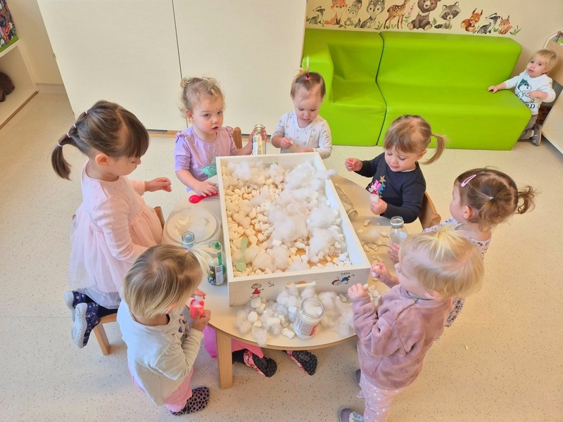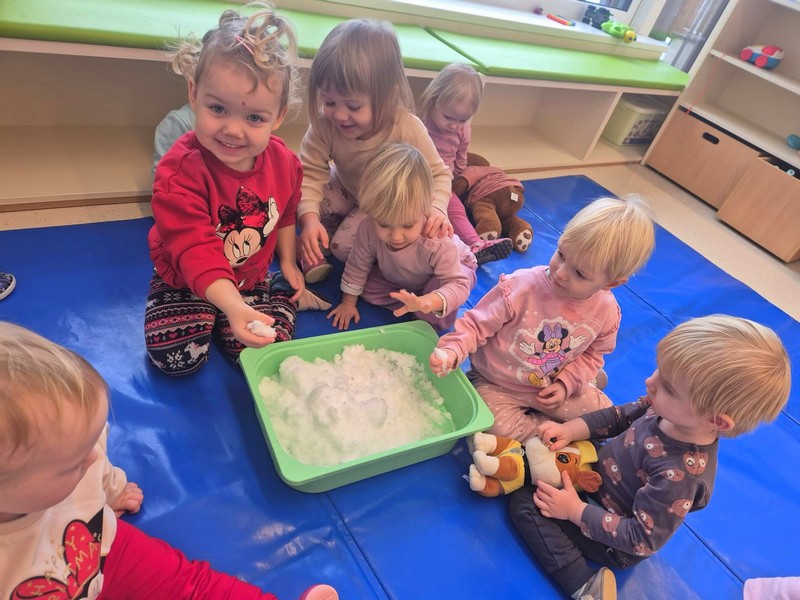Sneg nas je tudi prišel obiskat v igralnico, bil je hladen in kompakten toda, ko smo se vrnili iz igrišča pa ga več ni bilo. Ostala je samo voda in tako smo spoznali, da če sneg dobi toplota in ni na hladnem izgine in se stopi.