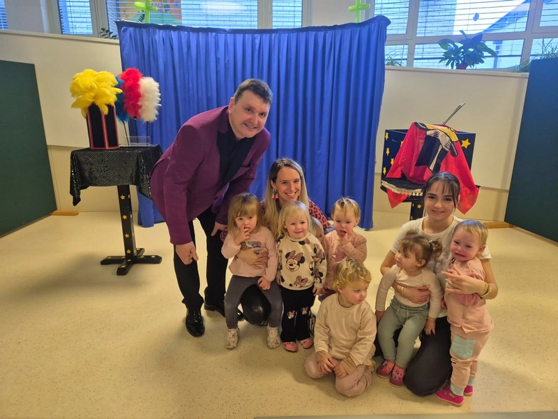 Seveda pa ni primanjkovalo tudi čarovnije, saj nas je namreč obiskal čarodej Andrej. Ringarajčki smo se z zanimanjem v očeh odpravili na predstavo v skupni prostor. Čarodej nam je pokazal mnogo zanimivih trikov in čarovnij za na konec pa nam še iz balonov napihnil rožico in žirafo, ki krasita našo igralnico.