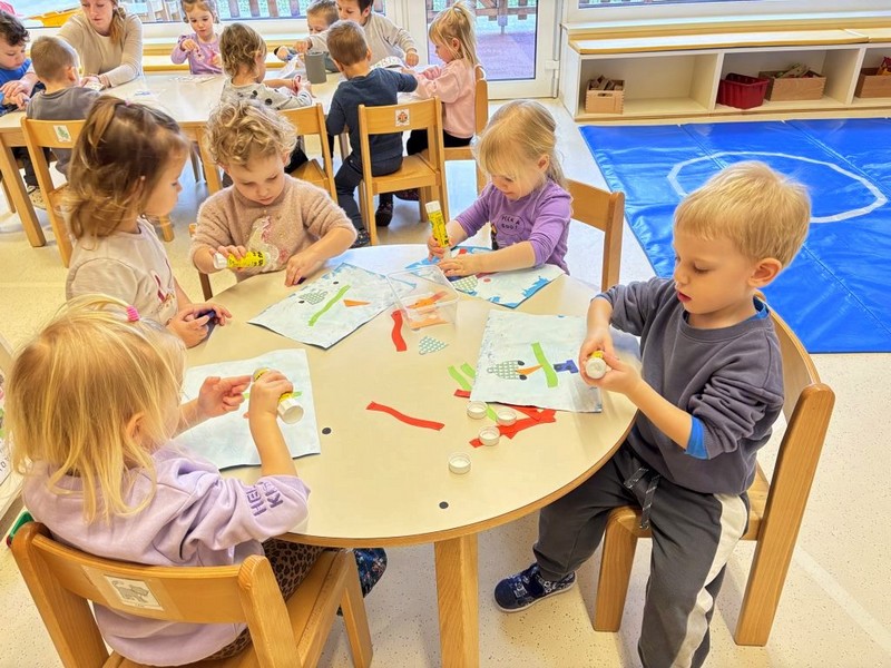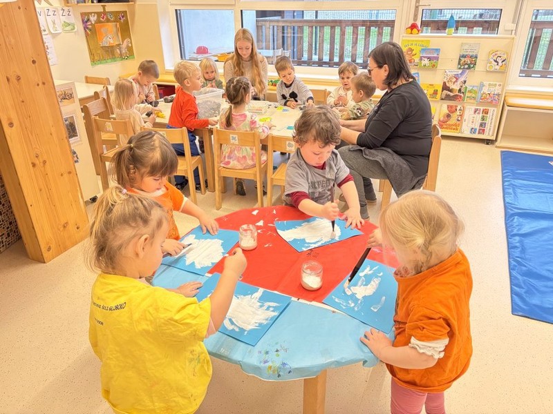 Ko je sonce stalilo sneg, so otroci v igralnici likovno ustvarjali stopljenega snežaka, lepili vzorce na papirnate rokavičke, slikali z vodenimi barvami motiv kape, oblikovali snežake iz plastelina, risali na velik format, strigli s škarjami zimski motiv, prepevali nove pesmi o zimi in igrali na male ritmične instrumente.