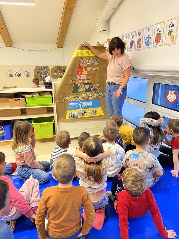 Na velik plakat smo izdelali prehransko piramido, ki označuje vso hrano, ki jo Navihančki zaužijejo, ob tem pa predstavlja še, kako pomembna je tekočina za telo ter gibanje. Zdaj ob vsakem obroku v vrtcu hrano poimenujemo in jo uvrstimo na svoje mesto v piramidi.