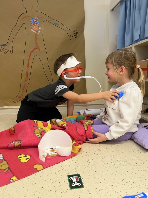 V igralnici smo uredili zdravniški kotiček, v katerem otroci izvajajo igro vlog zdravnika, medicinskih sester ter pacienta.