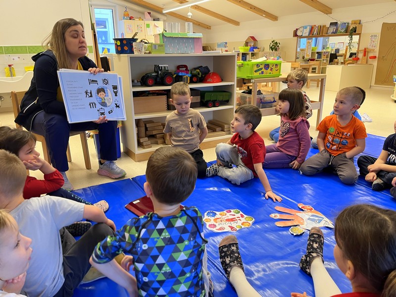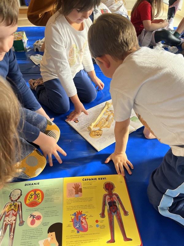 Ravno zaradi te teme, pa smo v tem mesecu bili deležni kar dveh obiskov medicinskih sester - prvi obisk je bil prihod mamice (medicinske sestre) dečka iz skupine, ki nam je predstavila kosti, kako jih zdravniki “slikajo” in kaj naredijo ob zlomu, delo našega srca, delovanje stetoskopa in kako pravilno povijemo rano; drug obisk pa je bil iz zdravstvenega doma Brežice, ko je k nam zavila medicinska sesrta Amadeja in nam predstavila zgodbo o higieni telesa in rok, ter kako poskrbimo, da zaustavimo širjenje bakterij.