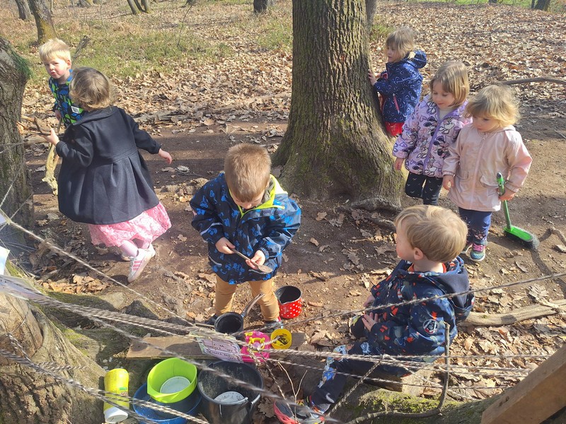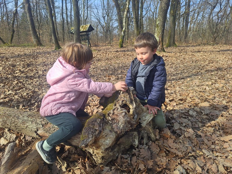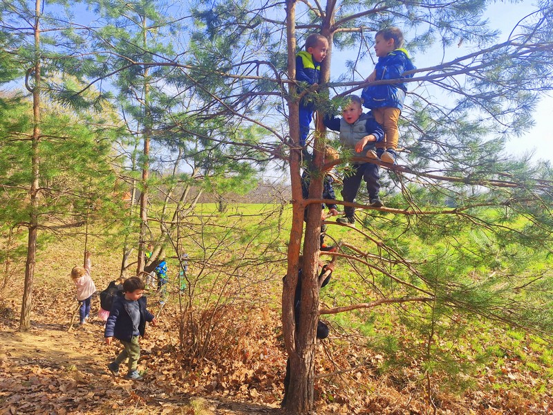 Ob branju knjig smo raziskovali, kako zraste drevo, roža, grm, ter se pogovarjali o tem, kaj vse rastline potrebujejo da zacvetijo. Tako smo na sprehodih z radovednostjo opazovali in spremljali prebujanje narave in prve znanilce pomladi. Srečali smo že kakšno čebelico, prisluhnili ptičjemu petju in večkrat obiskali gozd. Naj vam povem, da smo tam hitro ugotovili, da nas spomladanska utrujenost še ni ujela, saj smo z veliko energije plezali na veje, pometali listje in prenašali debla in veje.