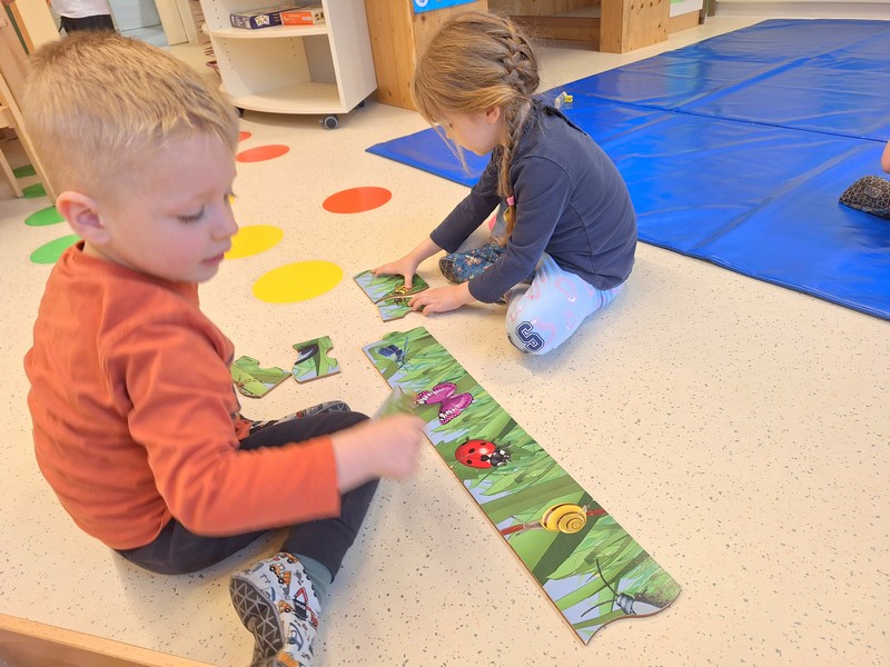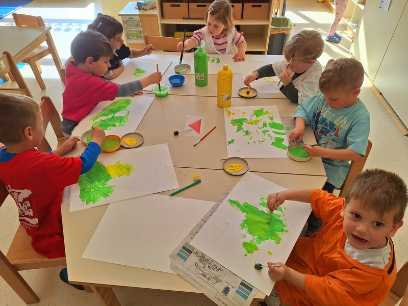Tudi v igralnici je »zadišalo« po pomladi. Skupaj smo jo okrasili s pisanimi izdelki, pri likovnem ustvarjanju pa smo izdelali travnik cvetočih rož, ki je v igralnico prinesel še več živahnih barv; otroci so uživali v barvah, lepljenju, sestavljanju, risanju in kombiniranju različnih materialov.