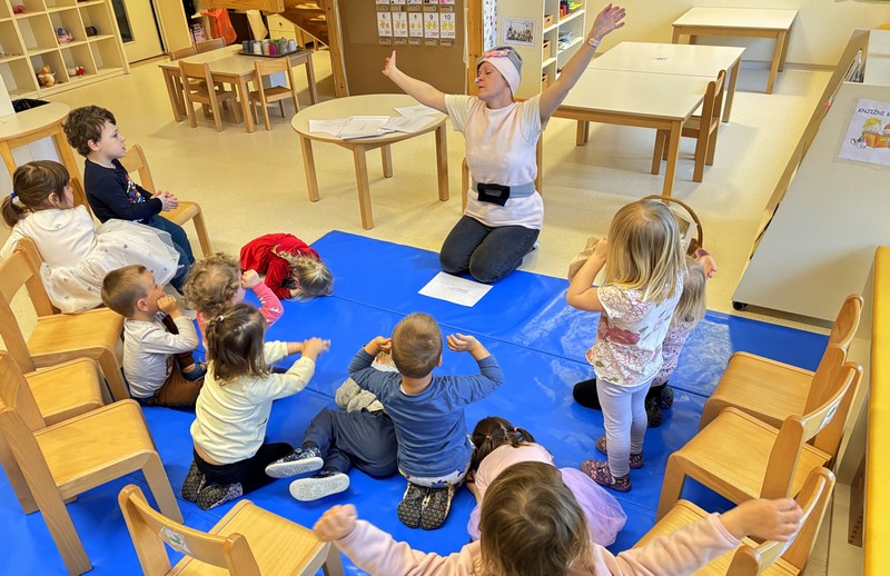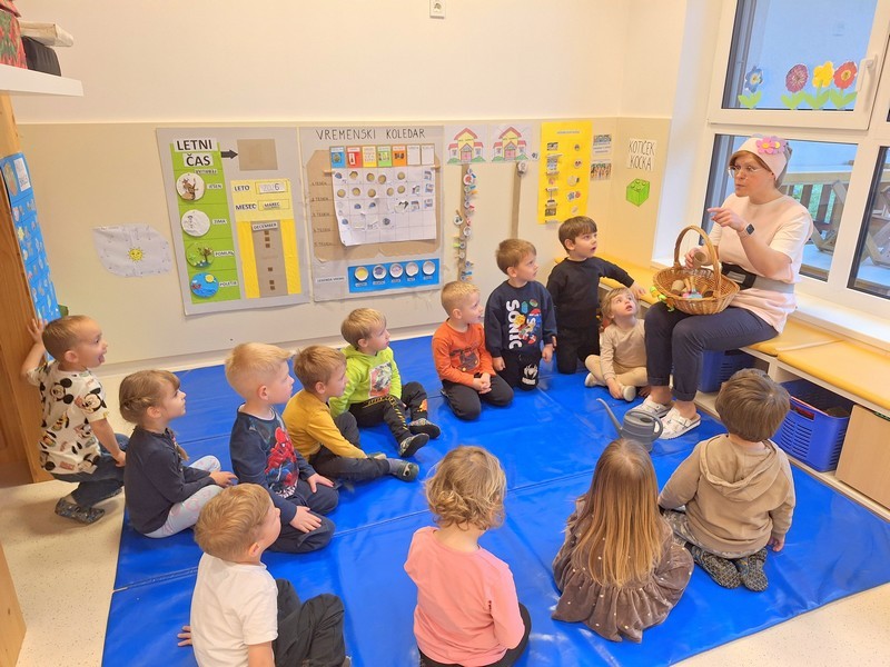 Prihod pomladi so v vrtcu obeležili na prav poseben način. Otroke je po skupinah obiskala pomladna palčica, ki jih je popeljala v domišljijski svet pomladi. S pomočjo gibalne zgodbe so skupaj raziskovali, kako se narava prebuja in kako pomlad počasi prihaja med nas.