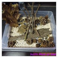 Danes po obisku gozda skupaj z otrokom pripravimo naravno senzorično škatlo. Osnova senzorične škatle je bil riž, v škatlo potem položite kamne, palčke, vejice, prazno polžjo hišico, pero, plodove in storže. Poleg dodajte še žlice različnih velikosti.