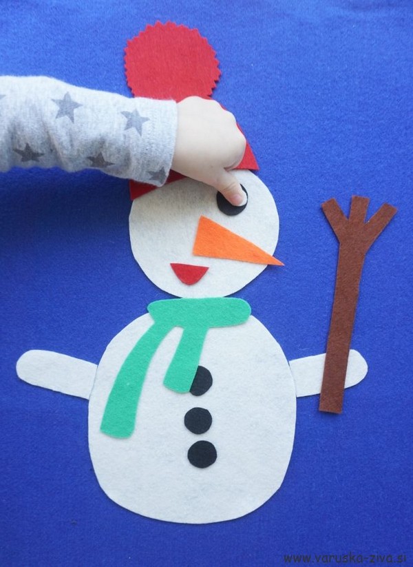 Pokažite mu, kako narediti snežaka z nekaj preprostimi materiali (vata, role, škatle, gumbi, papirnati krožnik, različni bel papir, odpadne plastenke, stiroporne krogle, zamaški …).
