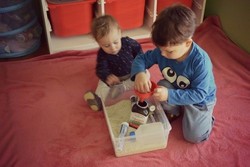 Različne senzorične posode za igro so otrokom vedno zelo zanimive. Gre za posode (navadno uporabimo plastično škatlo/zaboj, ki je dovolj velik), v katere damo različne materiale in predmete: