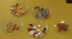 Pripravite različne predmete za eksperimentiranje: zamaške iz plute, kovance, kovinsko žlico, gumijasti trak, kamenčke, ključe, paličice, gumbe, pokrovčke za steklenice, kovinske sponke, bucike, ALU folijo, lesene kroglice, radirko, zamaške, papirnate lističe. Dodate lahko še vse, kar se vam zdi zanimivo. Naj vam otrok pomaga pri zbiranju idej.